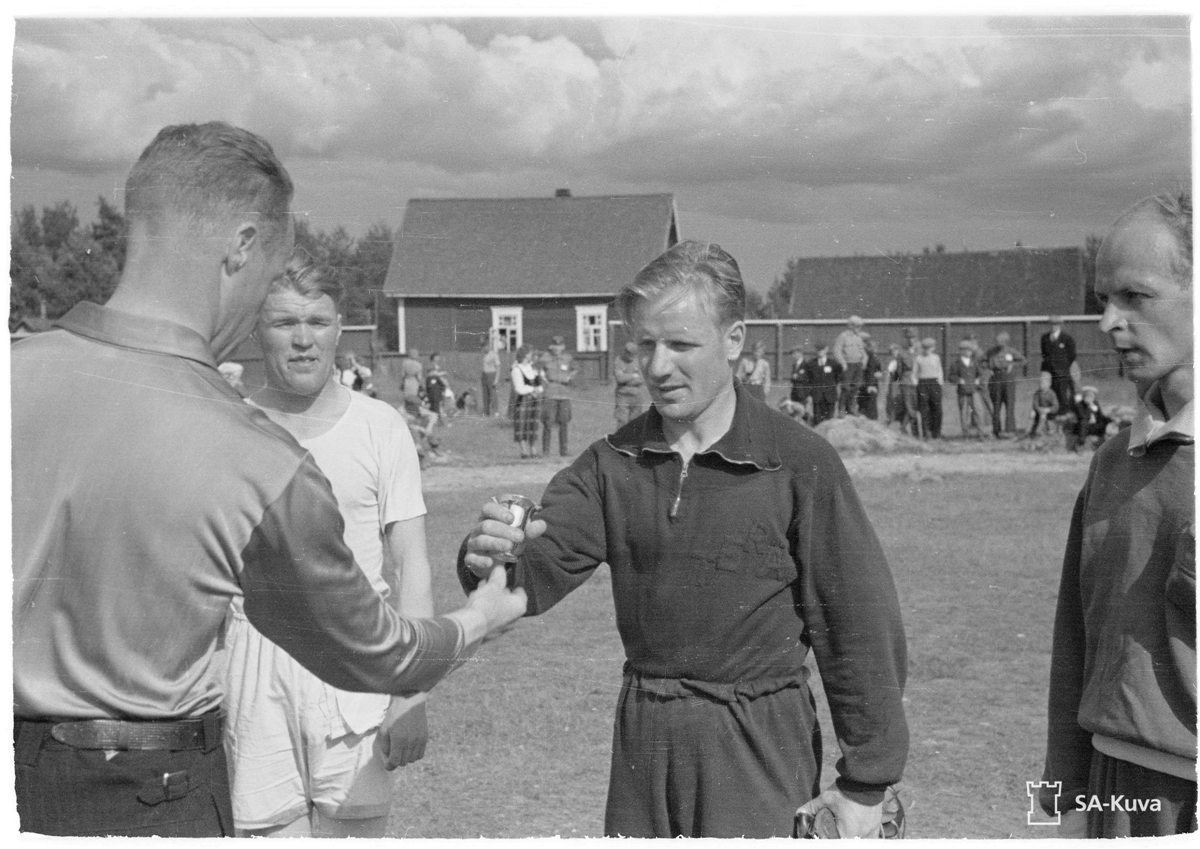 Käkisalmen skp:n urheilukilpailuista Räisälän urheilukentällä juhannuksena 1943: Palkintojen jakoa. Räisälä 1943.06.24. (Lähde: SA-kuva)