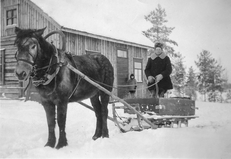 Veikko Leinonen lähdössä hevosineen sotaan, rapulla naapurin poika Sauli Jortikka.
