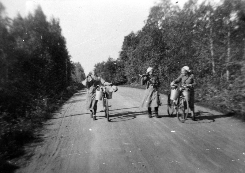Kivipellon siivoojalotat palaamassa Sakkalista majapaikalleen koululle elokuussa 1941. Vas. Lahja Javanainen (myöh. Ruponen), Aune Javanainen (myöh. Virolainen) ja Hilkka Niittymäki (myöh. Vanhanen).