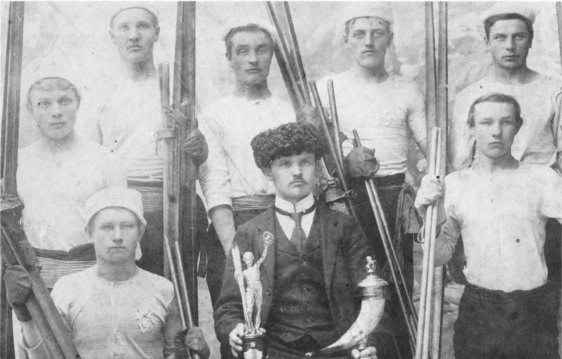 Räisälän Pamaus Viipurissa 1910 hiihtokilpailuissa. Kiertopalkinto keskellä istuvalla kansanopiston johtaja maisteri Antti Niskalalla. Edessä Asikaisen veljekset oik. Pekka ja vas. Matti. Matin takana Antti Javanainen, 4. vas. Antti Heikkonen, takarivissä äärimmäisenä oikealla Juho Torsti.