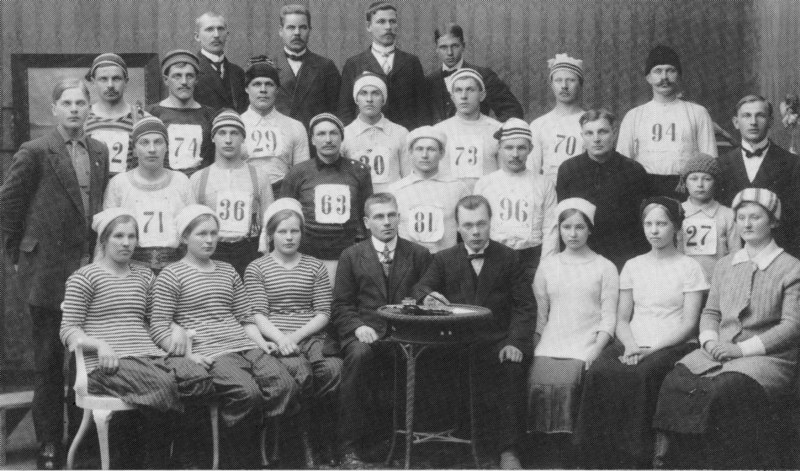 Pamauksen hiihtäjiä n. 1911 vas. tiurilaisia, oik. hytinlahtelaisia. Palkintotuomarina ed. 4. oik. Veikko Läheniemi.