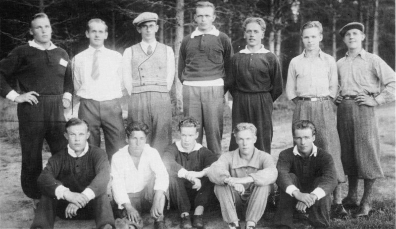 Pamauksen uuden veryttelypuvun jakotilaisuudessa 1934. Ed. vas. Raikas Marila, Viljo Ohvo, Heikki Kuokkanen, Heikki Majala ja Jooseppi Seppä. Tak. vas. Tenho Marila, Lauri Jääskeläinen, Olavi Vilppula, Olavi Miilman, Veikko Tonteri, Yrjö Kuokkanen ja Tatu Pelkonen.