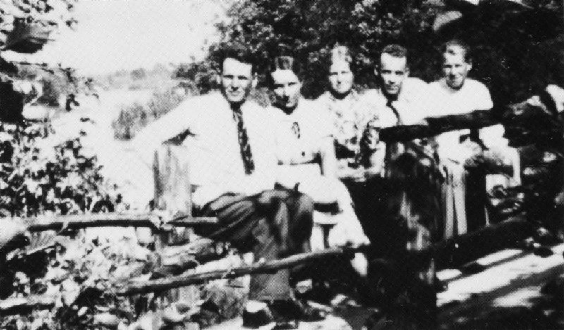 Timoskan nuoria kesäisenä sunnuntaina 1938. Vas. Nikolai Sinkko (Kirilä), Senja Sinkko (Lamminkorpi), Lempi Honkanen, Nikolai Sinkko (Lamminkorpi), Johannes Sinkko (Lamminkorpi).