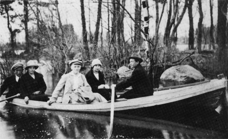 Veneretkeilijöitä Unnunkosken osuuskaupan rannassa olevan pienen saaren edustalla 1920-luvulla. Vas. Esa Haikonen, Saima Vesalainen, Vilho Suutari (Olla-Vilho), Tyyne Hoppania ja Antti Asikainen.