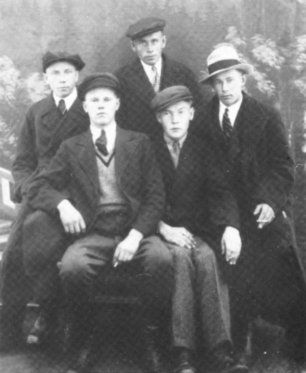 Tekemälahden poikia Käkisalmen markkinoilla 1935. Eino Pitkänen, Lauri Hannukainen, Antti Poutanen, Väinö Nikkanen ja Antti Pitkänen.