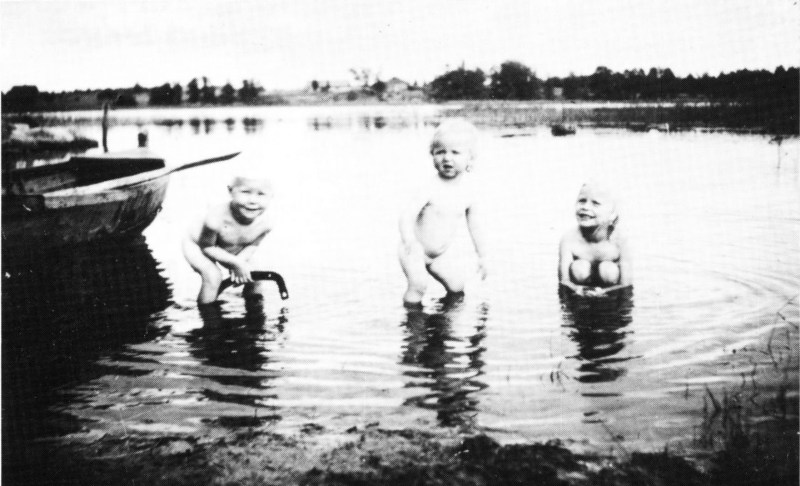 Tattarin rannassa 1943. Vas. Seppo Puha, Kaarina Kaatonen ja Pirkko Puha. Taustalla häämöttää Rammansaari.