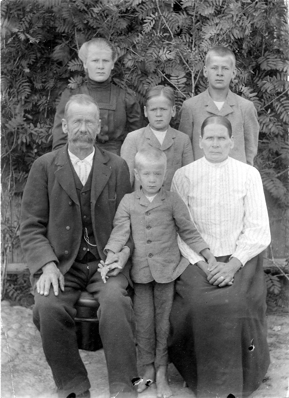 Kuisman perhe Siirlahdesta elokuussa v. 1910. Kuvassa vanhemmat Antti ja Eeva (o.s. Paavilainen) sekä lapsista Maiju, Vilho, Eemeli ja vanhempien sylissä Armas. Kuva Fabian Laukkanen.