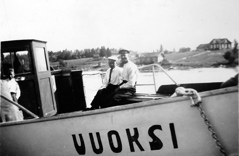 Vuoksen kapteenina oli mm. Antti Nisonen, etualalla oikealla. Takana näkyy Niemenkylän puoleisella rannalla Matti Suutarin talo 1. Purlakan talo, kuten kyläläiset sanoivat.