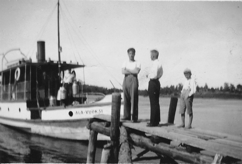Ala-Vuoksi Virtakallion eli Ruotsalaisen laiturissa. Vasemmalla Eelis Rouhainen, tuntematon ja Arvi Naukkarinen. Unnunkoskelta lähdettäessä laivojen poikkeamat laiturit olivat Virtakallion, Tekemälahden, (Kaukolan) Tervolan, Hässaaren eli Peltosen, Hirvisaaren (Käkisalmen mlk.) ja Suotniemen laiturit. Jos menijöitä tai tulijoita oli, laiva poikkesi muissakin laitureissa kuten Läheniemi 1. Sapukan laiturissa.
