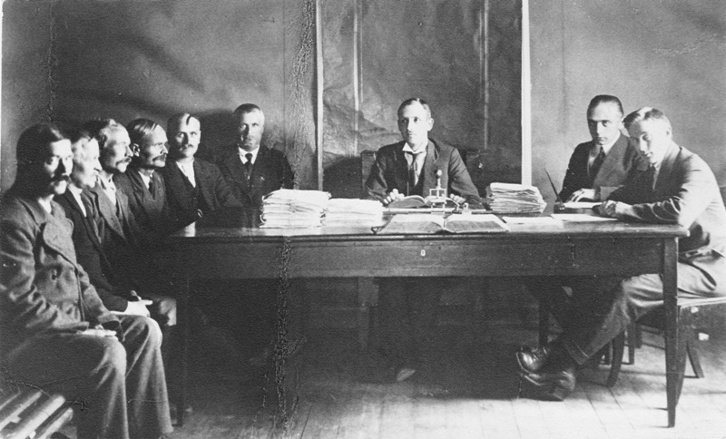 Räisälän kihlakunnanoikeuden istunto talvikäräjillä keväällä 1921. Kuvassa oikealta virallinen syyttäjä vt. nimismies Hugo Hedlund, lakit. ylioppilas Robert Rainio, kihlakunnanoikeuden puheenjohtaja hovioik. auskultantti Väinö Gunnar Lundell, varatuomari Juho Kuismin sekä lautamiehet Matti Kiuru, Juho Torsti, Olli Kopra, Juho Paavilainen ja Antti Huppunen.