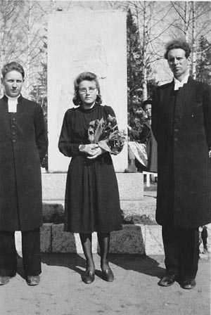 Pitkän päivän matkaRäisälän viimeinen kirkkoherra Jorma HelasvuoHelmi-maaliskuun vaihteessa 1928 astui Kirvun Sairalan asemalla junasta alas nuori mies, jonka häntä vastaanottamaan tullut renkipoika tunnisti helposti tavanomaista suuremmasta pituudesta. Tuo mies oli pastori Jorma Helasvuo, jonka tuomiokapituli oli määrännyt Kirvun naapurikunnan, Räisälän, kirkkoherran apulaiseksi. ![]() Jorma oli juuri päättänyt asevelvollisuutensa Lappeenrannassa. - Hänelle oli tuottanut ensin pieniä vaikeuksia löytää kartalta koko tuota Karjalan kannaksen pitäjää, eikä hiin voinut silloin aavistaa, miten pitkän ja vaikeankin taipaleen hiin tulisi elämässään Räisälän seurakunnan kanssa kulkemaan. Ajettiin hevosella pitkin Helisevä-järven jäätä, kuljettiin lopulta ohi ajomiehen osoittaman kappalaisen (Robert Rainio) pappilan, jonka pihalla koira haukkui. Eipä aavistanut Jorma sitäkään, että tuon talon tyttärestä, Milkasta, tulisi hänelle myöhemmin aviopuoliso. Saavuttiin kirkkoherran pappilan pihaan. Vanhahko, hiukan sairaalloinen Sixtus Olsson ja hänen Anna-vaimonsa ottivat tulijan ystävällisesti vastaan, ja hänet majoitettiin apupapin huoneeseen, johon Olsson oli teettänyt pidennetyn sängyn saatuaan jostain tiedon uuden apulaisensa suuresta koosta. Jo seuraavan vuoden (1929) lopulla kuoli edellä mainittu Räisälän kappalainen yllättäen 59-vuotiaana, ja Jorma valittiin hänen virkaansa ensin vt:ksi ja v.1931 vakituiseksi kappalaiseksi. - Kirkkoherra Olssonin horjuva terveys tuli yhä heikommaksi. Siihen aikaan kirkkoherran virasta ei oikeastaan jääty eläkkeelle, ja näin Jorma käytännössä toimi myös vt. kirkkoherrana. Olssonin lopulta kuoltua valittiin Räisälän kirkkoherraksi lääninrovasti Vihtori Heinikainen (1939-41). Tuskin oli piispa ehtinyt asettaa hänet virkaansa, kun syttyi Talvisota ja pian oli kaikkien Räisälästä lähdettävä. Räisäläisten sijoituspaikkakunnaksi määrättiin Ilmajoki, jonne evakkoja alkoi pian virrata tuhansia. Tämän vuoksi lähetettiin kappalainen Helasvuo heitä sinne jouluksi tervehtimään. Tammikuun puolivälistä hän siirtyi toimimaan Ilmajoelle, mistä vain pistäytyi Räisälässä. Hän avasi Ilmajoelle Räisälän kirkkoherranviraston alaosaston ja osallistui huoltotoimintaan sekä seurakuntatyöhön paikallisen papiston kanssa. Kirkkoherra saapui Ilmajoelle 27.3.1940, ja jatkoi siellä Jorman kanssa Räisälän seurakuntatyötä tavattomaan ahtauteen sijoitetun seurakunnan keskuudessa. Ilmajoelta räisäläisiä sitten siroteltiin muihinkin pitäjiin. Talvisodan päätyttyä kappalaisemme siirtyi Karijoen pappilaan; syksyllä 1940 hän piti mm. rippikoulun Kauhajoella ja vuoden lopulla tuli siirtyminen Jalasjärvelle, jonka kappalaiseksi Jorma valittiin sitten v:n 1941 keväällä. Kun Jatkosota alkoi ja Suomi sai luovutetun Karjalan taas haltuunsa, palasi Jorma Räisälään takaisin 1.6.43 sen kirkkoherraksi valittuna. Piispa Ilmari Salomies saapui 30.4.44 asettamaan hänet virkaansa. Piispa puhui "hyvä paimen" tekstistä korostaen erityisesti paimenen tehtävää laumansa koossapitäjänä. Tuskin kukaan silloin aavisti, että tämä lauma 1,5 kuukauden kuluttua joutui uudelleen vaellustielle. Monet olivat saaneet lähtömääräyksensä kokoontuessaan viimeisen kerran kotikirkkoonsa 18.6.44. Kahden päivän kuluttua tästä joutui räisäläisten evakkojuna Elisenvaaran tuhoisaan suur-pommitukseen. Räisälään jätettiin joitakin työryhmiä, joita Jorma kävi vielä elokuussa tervehtimässä ja piti sotilaspappien avustamana iltahartauden kirkossa 23.8.44. ![]() Räisäläiset sijoitettiin aluksi Peräseinäjoelle ja Jalasjärvelle, jonne Jormakin majoitettiin. Kun räisäläisten pääosa muutti vähitellen Satakuntaan ja Varsinais-Suomeen, siirtyi kirkkoherrankin toimipaikka Eurajoelle. Jorma johti siirtoseurakuntaansa aina vuoden 1949 loppuun, jolloin Räisälän seurakunta lakkautettiin. Varsinainen seurakunnan lopettajaisjuhla vietettiin 18.12.1949 Kokemäellä. Vaikka Jorma v:sta 1950 toimi uusissa kirkkoherranviroissaan Jämsässä ja sitten Keravalla, säilyi hänen asemansa eräänlaisena koko Suomen räisäläisten hengellisenä johtajana aina uudelle vuosituhannelle saakka. Hänelle suodun pitkän iän ansiosta hän sai olla osaltaan johdattelemassa aivan uuttakin räisäläisten sukupolvea kohti Taivaan kotia. Jorma oli kummisetäni. Hänellä oli monta muutakin kummilasta ja todella paljon kaikenlaisia tehtäviä ja ihmisiä, joille hän huomiotaan jakoi. Siksi minun oli usein pakko ihmetellä, miten hänellä oli aikaa niin usein soitella minullekin; toki soitin hänelle silloin tällöin itsekin tai tapasin häntä henkilökohtaisesti. Hän tuntui olevan viimeiseen asti tavattoman hyvin perillä nyky-maailmankin tapahtumista, varsinkin mikäli ne koskivat räisäläisiä tai sitten uskontoon ja yleensäkin ihmisen elämänvaellukseen liittyviä asioita. Korkeaan ikään tullessa hänen mielipiteensä entistä suvaitsevammiksi, muita ymmärtäviksi. Hänellä oli kyky kuunnella ja arvostaa kanssaihmistensä ajatuksia ja antaa niiden mahdollisesti vaikuttaa omiinkin mielipiteisiinsä. Viitisen vuotta sitten kirjoitin hänestä jonkin tapaamisen jälkeen eräänlaisen runon. jota en kuitenkaan halunnut kellekään näyttää, en varsinkaan Jormalle, koska tiesin, että hän ei ehkä olisi pitänyt siitä. Vielä viimeisen kerran hänet sairaalassa tavatessani hän nimittäin sanoi näin: "Minä olen asemani vuoksi saanut niin paljon kunniaa, joka ei ole minulle kuulunut - muistan usein kirkkoherra Olssonin sanat: "Kaikki on Jumalan armoa". Jorma-setä93 vuotta Mikko Rainio Jorma Taneli Helasvuo (v:een 1926 Hällström)s. 25.5.1903 Heinolassa, k.12.11.2001 Helsingissä Ylioppilas -21, teologinen erotutkinto -26, vihitty papiksi 1927, pastoraalitutkinto 1930. N.k. armovuoden saarnaajana Hirvensalmella 1927, asevelvollisuusaikanaan Lappeenrannan rakuunarykmentin past