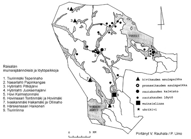 KivikausiRäisälän pitäjä sijaitsi Karjalan kannaksen koillisosassa. Sen pinta-ala oli vesistöjä lukuunottamatta 403,1 km2. Vesistöt Iisäsivät pitäjän kokonaisalaa huomattavasti, sillä pitäjässä oli erittäin runsaasti järviä ja jokia. Leimaa antavana koko Räisälän maisemakuvalle oli Vuoksi, joka halkaisi pitäjän etelästä pohjoiseen. Siihen yhtyivät monet muut pienemmät vesireitit. Vuoksi ei esiinny vain Räisälän maisemakuvassa. Se on jättänyt omat jälkensä myös paikkakunnan vaiherikkaaseen asutushistoriaan. Asutus on nimittäin aina pyrkinyt keskittymään Vuoksen varsille, ja Vuoksi on aikanaan luovuttanut pitäjälle sen hedelmällisimmät viljelysalueet. Kun ensimmäiset asukkaat saapuivat Räisälän seuduille, oli suurin osa pitäjää veden vallassa Laatokan vyörytellessä siellä laineitaan. Laatokan pinta oli näet silloin noin 21-22 metriä merenpintaa ylempänä. Sen vedet purkautuivat Heinjoen-Viipurin kautta Suomenlahteen. Laatokasta, Käkisalmen seuduilta, pisti laaja lahti lounaaseen Äyräpään ja Muolaan järvien suuntaan. Räisälästä kuului silloin vain pitäjän ylävämpi pohjoisosa kiinteään mantereeseen. Pitäjän itä- ja keskiosat olivat veden peitossa. Maaston korkeimmat kohdat kohosivat saarina näkyviin. Unnunkosken ja Helisevänjärven välillä oli runsaasti pieniä saaria. Osa Härskeensaaresta oli niin ikään kuivana. Purisevan harju muodosti etelästä pohjoiseen kulkevan saarijonon. Papinkankaan tienoot kuuluivat luoteesta mainittuun Laatokan lahteen pistävään niemeen. Torhonjärven rantamat olivat myös veden alla. Rantaviiva kulki järven itäpuolella Humalaisten kylän korkeimpien harjujen länsilaitaa. Konnitsanjoen laaksoa pitkin pisti pitkä lahdeke Kiimajärven suuntaan Pyhäjärven puolelle. ![]() Kivikauden lopulla muuttuivat luonnonsuhteet kokonaan toisenlaisiksi. Maa kohosi hiljalleen. Luoteessa kohoaminen oli voimakkaampaa kuin kaakossa ja vesi alkoi sen tähden tulvia Laatokan etelärannalle. Vihdoin Laatokka puhkaisi itselleen sillä suunnalla Suomenlahteen uuden kulkuväylän, Nevan. Tämä on eräiden tutkijain mukaan tapahtunut viimeistään pronssikaudella, viimeisen esi-kristillisen vuosituhannen alussa. Laatokan pinta alkoi nyt hiljalleen laskea ja Räisälän tienoot nousivat vedestä. Veden pinnan laskiessa hahmoittui Vuoksen pohjoinen laskuhaara. Unnunkosken ja Käkisalmen välille muodostui laaja järvimäinen selkä, joka myöhemmän historiallisen ajan venäläisissä lähteissä kulkee Uusjärven nimellä. Tätä pohjoista, Räisälän kautta kulkevaa haaraa myöten purkautuivat koko Vuoksen vesistön vesimassat Laatokkaan. Toisaalta säilyi vesiyhteys Heinjoen kautta Viipuriin vielä kauan. Keskiaikana ja uuden ajan alussa liikennöitiin Viipurin-Käkisalmen reittiä vielä melkoisesti, ja aina 1800-luvun puoliväliin asti on pienillä veneillä sen eniten maatuneissakin kohdissa kuljettu. Räisälän tienoot ovat tulleet ensimmäisen kerran asutuiksi kivikaudella. Kaukolan-Räisälän saaristoinen rannikko tarjosi erinomaisia asuinpaikkoja kivikauden ihmisille, joiden toimeentulo oli suurelta osalta riippuvainen vedenantimista. Nämä alueet kuuluvatkin kivikauden rikkaimpiin löytöalueisiin maassamme. Räisälässä näyttää kivikauden asutus keskittyneen pääasiassa pitäjän pohjoisosaan, mikä sen ajan luonnonsuhteiden kannaltakin on täysin ymmärrettävää. Pitäjän Iänsi- ja eteläosassa on vain pari huomattavaa löytöpaikkaa. Löytöpaikat ovat yleensä 21 metrin korkeuskäyrän yläpuolella, sillä sitä ala-vammat paikat olivat silloin - kuten edellä on esitetty - veden peitossa. Kiinteitä asuinpaikkoja on todettu pitäjän pohjoisosassa Hytinlahden Sylijärvellä, Jouksemanjärven ja Yli-Pitkäjärven rannoilta sekä Rautakoprasta. Pitäjän länsiosassa on Papinkankaan asuinpaikka ja eteläosassa Teperinaho. Hajalöytöjä on tehty Tiurin Hovikylästä, Särkisalosta ja Härskeensaaresta. Sakari Pälsi on tutkinut Pitkäjärven löytöpaikkaa. Se sijaitsee Yli-Pitkäjärven Rantapellolla Antti Huppusen omistaman Ollan talon maalla, noin puolen kilometrin päässä mainitun järven eteläkärjestä. Järvi on nyt melkein kokonaan maatunut, sillä se on laskettu 1930-luvun alkupuolella, mutta kivikaudella löytö-alue kuului puheena olleen Laatokan lahden saaristorannikkoon, Noin 200 m pitkä ja 20-50 m leveä kaivausalue on hyvin tasaista hietamaata ja luonnostaan kivetöntä, sinänsä erinomainen kivikauden asuinpaikaksi. Ns. kulttuurikerroksen vahvuus vaihtelee 20 tai 30 senttimetristä 45 tai 60 senttimetriin. ![]() Pitkäjärvellä suoritetut kaivaukset ovat siinä suhteessa erikoisen merkityksellisiä, että niiden avulla on voitu selvittää kivikaudella käytetyn asumuksen, kodan, rakenne. Pitkäjärven kota on ollut pyöreä, läpimitaltaan noin 6 metriä. Maahan on ensin lyöty kymmenkunta pystysuoraa paalua. Niiden yläpäiden varaan on rakennettu vaakasuoraan niskapuiden muodostama kehys. Niska-puiden nojaan on asetettu vaippariu'ut siten, että kodan yläosaan on jäänyt pieni aukko. Näin muodostunut kartiomainen kehys on peitetty tuohilla, havuilla tai taljoilla. Pitkäjärven kodassa on oviaukon edessä ollut vielä kahdenpylvään varaan rakennettu eteiskatos. Kodan oviaukko ja eteinen ovat sijainneet järven puolella, jonne päin kodasta aukeni kaunis näköala. Muodoltaan kota on ollut samanlainen kuin eräiden nykyistenkin alkukantaisten kansojen käyttämät. Kodan sisällä, lähellä oviaukkoa, on ollut liesi. Se on rakennettu luonnonkivistä. Liesi on ollut sekä lämmönantajana että keittopaikkana. Savu on poistunut kodan katossa olevasta aukosta. Lattia on ollut nähtävästi kovaksi poljettua maata. Kodan takaosassa, tulisijan vieressä, on ollut makuupaikka. Se on ollut ehkä varpujen, kaislojen, taljain tai muiden pehmikkeiden peittämä. Kodan kummallakin seinustalla, pystypaalujen ja vaippariukujen välissä, on ollut luonnonkan