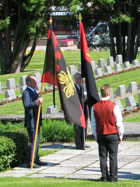Räisälä viiri - lippuRäisälä-viiri![]() Pitäjäjuhlien yhteydessä Helsingissä vuonna 1966 ratkaistiin Räisälä-viirin suunnittelukilpailu. Järjestetyssä äänestyksessä kokosi suurimman äänimäärän taiteilija Armas Lähteenkorvan ehdotus "Hovinsaaren risti". Tämän aiheen mukaan oli jo aikaisemmin valmistettu Pääkaupungin Räisäläiset r.y:n lippu, joka näin äänestettiin kaikkien räisäläisten yhteiseksi symboliksi. Räisäläisen Säätiön toimesta on yli neljän vuosikymmenen aikana valmistettu ja myyty satoja Räisälä-viirejä. Viirin heraldinen selostus: Mustassa kentässä punainen sakarakorkoinen lakio ja punainen aaltokoroinen tyviö. Kuviona kultainen Hovinsaaren risti. Ideatausta: Sakarakoro on linnaa tarkoittavana kuvaamassa Tiurin muinaislinnaa Räisälässä. Aaltokoro tarkoittaa Vuoksea. Hovinsaaren risti Räisälälle tunnusomaisena koristekuviona ilmentämässä muinaisajoista periytyvää kulttuuria. Väreinä luovutettua aluetta yhdistävänä Karjalan puna-musta sekä kulta. Räisälän lippu![]() Räisälä-julissa Säkylässä 1998 otettiin Räisäläisten Säätiön uusi lippu käyttöön. Lipun vihkimisen suoritti rovasti Hannu Pelkonen. Lippu on teetetty taiteilija Armas Lähteenkorvan suunnitteleman Räisälä-viirin pohjalta. Lipun naulaamisen toimittivat räisäläisten oma rovasti Jorma Helasvuo sekä säätiön valtuuskunnan puheenjohtaja Arvi Naukkarinen, hallituksen puheenjohtaja Heino P. Paavilainen, vapapuheenjohtaja Juhani Huppunen ja jäsenet Kerttu Javanainen, Ilkka Suutari ja Oiva Suutari. Räisälän lipun ulkonäkö on sama mitä on viirin. Räisäläisten Säätiön lipussa on lisänä lipun yläpuolella musta nauha, jossa lukee kultakirjaimin Räisäläisten Säätiö. Räisäläisten Säätiö lippu kuvassa etualalla. |