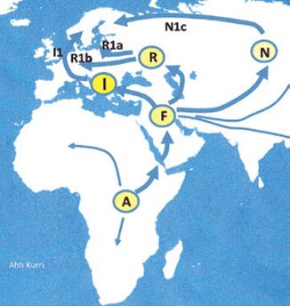 tärkeitä DNA-sukututkimukselle: 3) Lapsi perii geeninsä aina vanhemmiltaan, jotka taas ovat perineet ne vanhemmiltaan jne. Siksi meidän geeneissämme on läpi sukupolvien valunutta suorien esipolviemme perimää. Yhtenevien perimänosien perusteella etäisiäkin serkkuja voidaan tunnistaa DNA-testissä. 4) Geenimutaatiot ovat sukulinjan ”korvamerkkejä”. Kun geeni kopioituu vanhemmalta lapselle, sattuu satunnaisesti pieniä kopiointivirheitä, mutaatioita. Tämä hieman muuttunut geeni jatkaa taas kopioitumista seuraaville sukupolville. Näin ko. mutaatiosta on tullut mutaation saaneesta lapsesta alkavan sukuhaaran ”korvamerkki”. Tuon jälkeen korvamerkki seuraa kaikkia jälkeläisiä läpi sukupolvien. ”Aatami” ja ”Eeva” AfrikassaPerinnöllisyystiede todistaa, että kaikkien nykyihmisten juuret johtavat vain yhteen mieheen ja vain yhteen naiseen. He elivät Afrikassa, geneettinen ”Eeva” noin 180.000 vuotta sitten, geneettinen ”Aatami” noin 70.000 vuotta sitten. He eivät olleet maapallon ainoat ihmiset elinaikanaan, eivät pariskunta eivätkä edes eläneet samoilla vuosituhansilla. Mutta he ovat ainoat, joiden tytär- ja poikalinjat ovat säilyneet nykypäivään asti. Olemme siis kaikki kaukaista biologista sukua keskenämme. DNA-sukututkimus kertoo, keiden kanssa olemme lähempää sukua, ennustaa, kuinka läheistä ja hahmottaa, minkälaisen omat esi-isämme ja -äitimme ovat maapallolla esihistorian hämärässä vaeltaneet. Maapallon valloitus ja haploryhmätNoin 50.000 vuotta sitten joukko nykyihmisiä lähti liikkeelle Afrikasta. Nykyiset afrikkalaiset polveutuvat niistä, jotka jäivät sijoilleen. Liikkeelle lähteneet tulivat ensin Lähi-Itään, josta sitten levittäytyivät ympäri maapallon, vuosituhansien kuluessa. Nyt astuvat geenimutaatiot kuvaan! Miesten ”Aatamilta” lähtöisin oleviin Y-kromosomeihin alkoi tulla satunnaisia pieniä muutoksia. Myös ”Eevalta” lähtöisin olevaan mitokondrion DNA:n sisältämään perimään tuli pikku ”virheitä”. Nämä jäivät aina pysyviksi ”korvamerkeiksi” poika- ja tytärhaaroille ja niiden uusille haaroille eri puolilla maapalloa. Niiden perusteella tiedemiehet jakavat nyt ihmiskunnan isä- ja äitilinjoihin ja niiden alahaaroihin. Niitä kutsutaan haploryhmiksi. Tiedemiehet ovat antaneet mies- ja naishaploryhmille sekä mutaatioille kirjan- ja numerotunnukset. Mutaatiot ja DNA-testiDNA-testi tutkii, mitkä mutaatiot meidän perimämme sisältää. Niiden perusteella henkilö osataan sijoittaa tiettyyn mies- tai naishaploryhmään. Tiede on selvittänyt mutaatiolöydösten perusteella myös eri ”mies-ja naisklaanien” karkeat kulkureitit maapallolla. Oma haploryhmä kertoo siis omien esi-isien vaelluksesta, reitistä ja ajoituksesta. Mutaatiot ovat sukuhaarojen tunnusmerkkejä. Sukulaisilla on siis samoja mutaatioita perimässään. Kun DNA-testin tulosta verrataan muihin tuloksiin, löydetään yhtenevyyksien perusteella geenisukulaisia, ”osumia”. Yhtenevyyden määrä ennustaa, kuinka monen sukupolven etäisyydellä menneisyydessä on elänyt viimeinen yhteinen esivanhempi. Kun osumat ovat ilmoittaneet, missä heidän varhaisimmat esivanhempansa ovat asuneet, ne saattavat antaa vihjeitä siitä, mistä oma suku on tunnetuille asuinsijoilleen tullut. Suomen miesten haploryhmätSuomalaisista miehistä yli 98 % kuuluu johonkin haploryhmistä N, I, R1a tai R1b. Niiden viimeinen yhteinen esi-isä oli ”F”, joka eli Lähi-Idässä noin 35.000 vuotta sitten. Haarautumisen jälkeen meidän esi-isämme ovat vaeltaneet omia reittejään maapallolla ennen tuloaan Suomen kamaralle. Suomi on asutettu monena ajallisena kerrostumana, eri suunnilta. Suurin mieshaploryhmä N (n. 60 %) on tullut Suomeen idästä, toiseksi suurin I (n. 30 %) lännestä. Eri haploryhmät ovat vuosituhansien aikana levinneet koko maahan, mutta edelleen N- haploryhmä on Itä-Suomessa yleisempi kuin koko Suomessa keskimäärin, I-haploryhmä Länsi-Suomessa yleisempi kuin koko Suomessa keskimäärin. Karjalainen miessuku voi kuulua mihin tahansa näistä – tai johonkin harvinaisempaan. Suomen naisten haploryhmätSuomen naiset ovat äitilinjoiltaan ”länsieurooppalaisempia” kuin miehet. Runsaslukuisin äitilinja Suomessa on haploryhmä H, johon kuuluu noin 40 % väestöstä. Se on yleisin haploryhmä myös koko Euroopassa (44 %). |