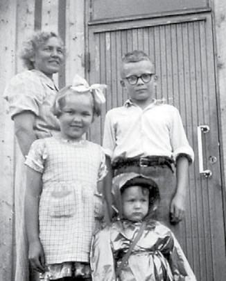Kirjoittaja kotinsa portailla v. 1953. Takana äiti Elsa Raja-aho, vieressä