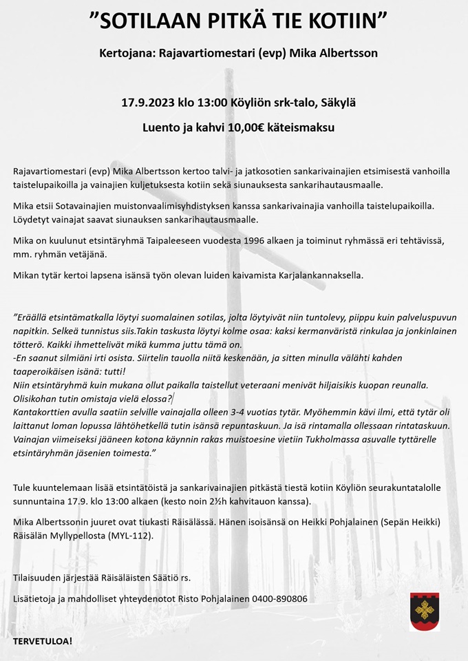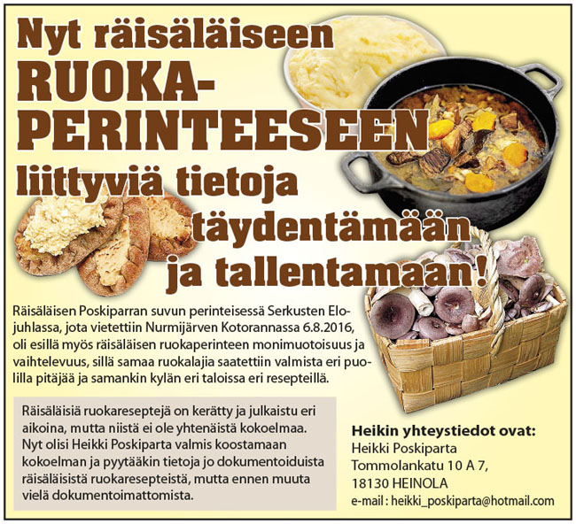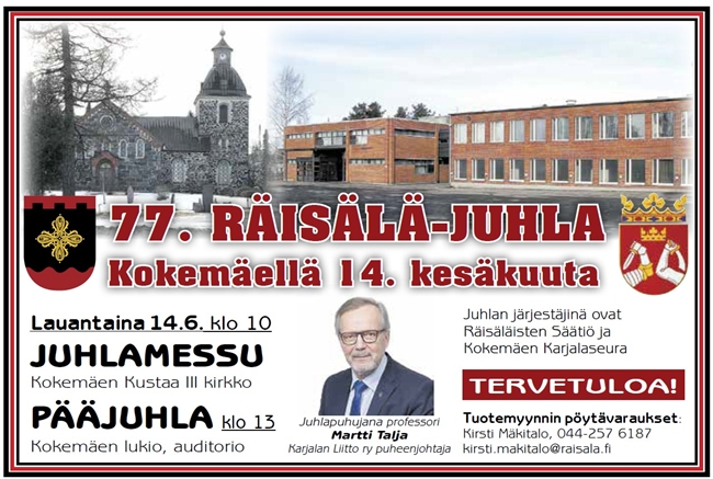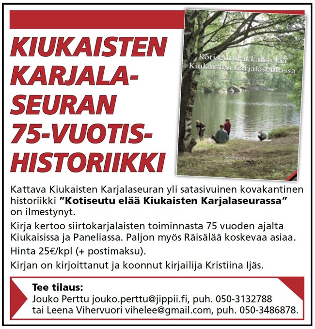 (Räisälä-osiossa havaituista puutteista ja virheistä samoin kuin niiden korjausehdotuksista pyydetään ottamaan yhteyttä tiedot koonneeseen Antti Kuismaan joko puhelimitse nroon 040-5480275 tai sähköpostitse osoitteeseen anseri.antti1937@gmail.com)