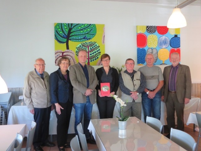 "Kotiseutumatkojen Siirlahti"-kirjan toimituskunta kirjan valmistujaisissa Humppilassa 24.9.2017. Kuvassa vasemmalta Kauko Jaakkola, Maija Jaakkola, Ossi Kamppinen (toim.), Arja Keskinen, Veikko Malaska, Risto Luukkanen ja Antti Kuisma. (Toimituskuntaan kuulunut ja sairasvuoteellaan teoksen kieliasun tarkastanut Maija-Liisa Varila menehtyi kirjan painatusvaiheessa).