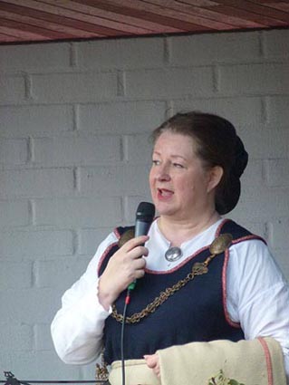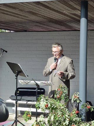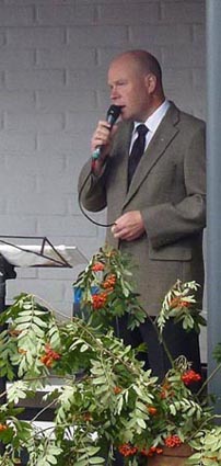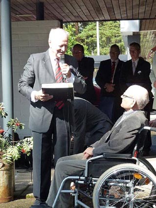 Museotiimin vetäjä Antti Kuisma mikrofonin ääressä vastaanottaa onnitteluja.