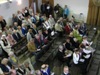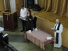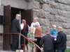 Juhlamessun vastaanottajat ovella Lauri Jantunen ja Tuula Lindqvist. Käsiohjelmien jakajat Leo ja Onni Rantahalvari