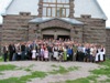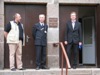 Räisälän kirkon muistolaatan paljastus. Vasemmalta tulkki, Robert Rainio (Räisäläisten Säätiö) ja Eduard Kamnev (Melnikovo)