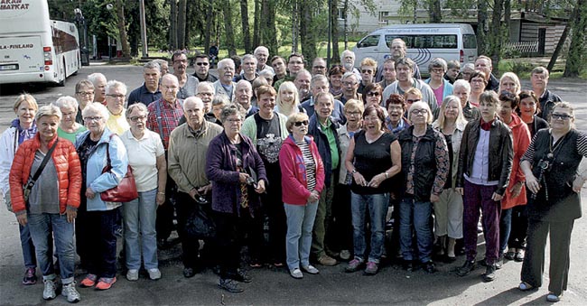 Mukana Karjalankannaksen retkellä Retkeläiset kokoontuneina yhteiskuvaan Kiviniemessä sijaitsevan hotelli Losevon piha-alueelle. Mukana oli noin 60 henkilöä, jotka liikkuivat Kannaksen alueella tutustumiskohteisiin kahdella eri bussilla. Kuljettajina olivat Pentti Karhinen ja Erkki Nummi. |