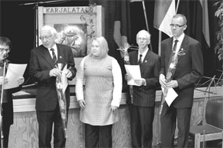 Karjalan Liiton varapuheenjohtaja Eevaliisa Kurki (vas.) jakoi ansiomerkit 60-v juhlassa Toivo Paavilaiselle, Anu Puusniekalle, Mikko Rainiolle ja Sami Suvirannalle.
