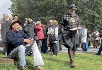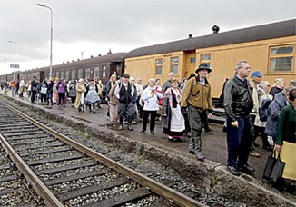 Höyryveturipuistossa monipuolista ohjelmaaMatkan kääntöpiste, jossa tämä Suomi 100-tapahtuma huipentui, oli räisäläisjuurisen ja kaikkien tunteman huippu-urheilijan Martti Vainion johtamassa Haapamäen Höyryveturipuistossa, jossa paljastettiin Eino Romppasen veistämä Suomineito 100v-pienoispatsas ja seppelöitiin kaksi Suomen historian vaiheissa merkittävästi näkynyttä 100-vuotiasta veturivanhusta sekä nautittiin Erkki Liikasen ja Pertti Arajuuren tarjoamasta musiikillisesta Evakkoreki2-ohjelmasta. Tämä junamatka oli nostalgiamatka menneeseen. Jo tapahtuman pääsylippu, iso pahvinen junalippu, jossa oli manillanarulenkki kaulaan ripustamista varten, antoi aavistaa, mitä tuleman pitää. (Oikea konduktööri tosiaan leimasi reikäpihdeillä matkalipun mennen tullen!) Asujen kirjo oli mahtavaSuurin osa matkalaisista oli oivaltanut, että tälle matkalle on varustauduttava asianmukaisella asulla ja mieluusti myös eväillä. Asujen kirjo oli mahtava, ja varmaan pukeutumisella oli myös suuri merkitys sen yhteisöllisen ja lämminhenkisen tunnelman syntymisessä, mikä evakkojunassa vallitsi koko matkan ajan.