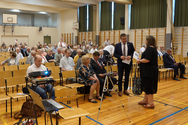 Pääjuhlan yleisöä Säkylän koulukskuksessa ennen juhlan alkua. Etualalla Kosketus Räisälään -esityksen pitäjä Peter Zakrevski, juhlapuheen esittäjä Pertti Hakanen ja Seila Hoppendorff.