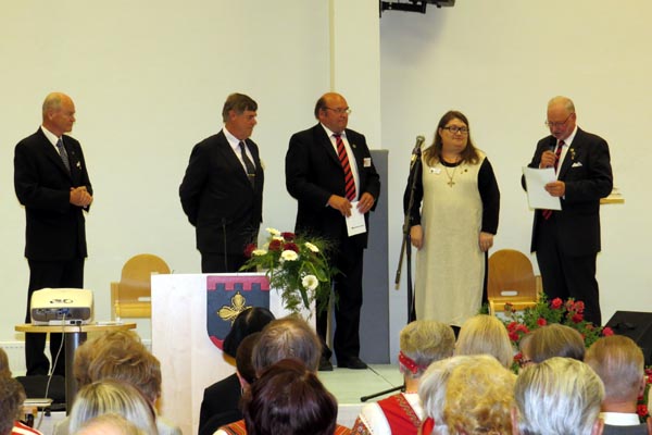 Kuvassa vasemmalta Ilkka Puukka, Jouko Perttu, Jouko Hämäläinen, Kirsti Mäkitalo ja Karjalan Liiton kultaisen ansiomerkin saanut Antti Kuisma.
